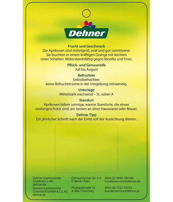Aprikosen sind warme, trockene Lagen gewohnt und bevorzugen deshalb auch bei uns einen sonnigen Platz, der etwas geschützt liegen sollte. Sie können die Pflanze gut unter ein Vordach an eine Südmauer setzen. Bei dem Boden ist wichtig, dass er leicht und durchlässig ist. Um die ideale Feuchte zu erlangen, sollte eine Drainage-Schicht im Kübel angebracht werden. Sobald die Erde angetrocknet ist, können Sie wieder gießen. Gedüngt wird mit einem speziellen Obstbaumdünger, nur mit den richtigen Nährstoffen können Sie hohe Ernten erzielen. Auch ein jährlicher Rückschnitt ist durchzuführen, am besten findet dieser nach der Ernte statt. Achten Sie darauf die Pflanze zu schneiden bevor Nachtfröste auftreten. Die leckeren Aprikosen können zwischen Juli und August geerntet werden. Es wird keine zweite Sorte als Befruchter benötigt, da ‚Compacta‘ selbstbefruchtend ist.