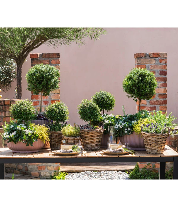 Ihre ursprüngliche Heimat ist der Mittelmeerraum, wo sie als immergrüner, stark verzweigter Strauch Höhen von 2 – 3 m erreichen kann. Bei uns wird die Brautmyrte, die auch als Echte oder Gemeine Myrte bekannt ist, als dekorative Kübelpflanze geschätzt, die ihr mediterranes Flair auf Terrassen und Balkonen verbreitet. Die Pflanze hat eine Fülle kleiner, dunkelgrüner, spitz zulaufender Blätter, die beim Zerreiben den typisch aromatischen Duft verströmen. Der schönste Schmuck aber sind die weißen Blüten, die den Sommer über, von Juni bis Oktober, wie lustige Schneeflocken zwischen dem grünen Blattwerk leuchten. Das Faszinierende an der Brautmyrte, die wir Ihnen hier als dekoratives Stämmchen anbieten, sind die zahlreichen Legenden, die sich um die Pflanze ranken. Im Altertum soll die Myrte Aphrodite geschmückt haben, auch bei den schönen Ägypterinnen war sie überaus beliebt. In unserem Kulturkreis wurde die Myrte lange als traditioneller Hochzeitsschmuck verwendet, weil sie als Symbol für Fruchtbarkeit, aber auch für Keuschheit und Reinheit galt.