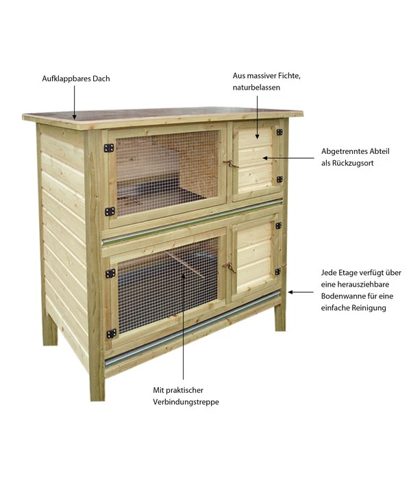 Mit dem Elmato® Kaninchenstall Bavaria King Jumper bieten Sie Ihren Kaninchen besonders viel Platz zum Spielen und Toben. Der Hasenstall eignet sich optimal für eine Haltung von Kaninchen, da der zweistöckige Kaninchenstall jedem Tier seinen nötigen Freiraum lässt. Der Elmato® Kaninchenstall Bavaria King Jumper aus naturbelassenem, massiven Fichtenholz sowie kesseldruckimprägnierten Rahmenhölzern ist daher qualitativ besonders hochwertig.