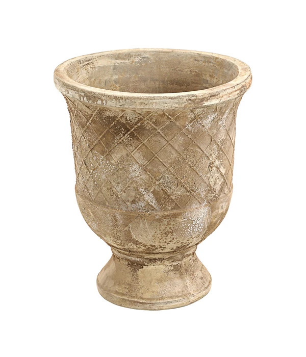 Dieser formschöne mit einer Rautenstruktur versehene, robuste Pflanzpokal Ferrara besteht aus Terrakotta. Terrakotta ist ein aus Ton hergestelltes keramisches, unglasiertes Erzeugnis und ist schon in der prähistorischen Zeit zu finden gewesen. Der Blumentopf hat ein klassisch, mediterranes Design und wirkt dadurch sehr antik. Was wiederum an die frühzeitliche Herkunft erinnert. Der wunderschöne Terrakotta-Pokal ist wetterbeständig und somit für den Innen- als auch für den Außenbereich sehr gut nutzbar. Terrakotta ist jedoch nicht frostbeständig. Daher empfiehlt es sich den antiken Pflanzpokal im Winter an einen frostsicheren Ort zu stellen. Im Boden des robusten Terrakotta-Pokals Ferrara ist ein Loch zur Vermeidung von Staunässe, deshalb benötigen Sie beim Gebrauch im Innenbereich den passenden Untersetzer.